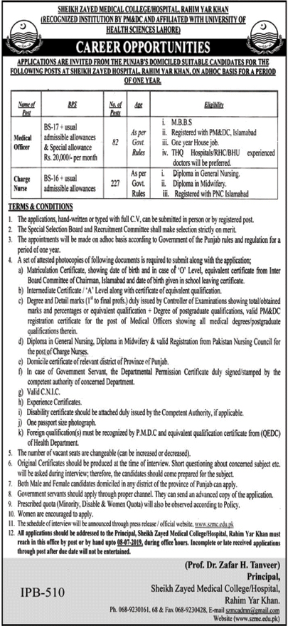 Charge Nurse and Medical Officer Posts are lying vacant in Sheikh Zayed Hospital Rahim Yar Khan. If you are meeting the eligibility for any post as per the instructions are written into the advertisement then must apply before till the last date. But remember that never get late in submitting the form otherwise you will be rejected to proceed for further hiring.